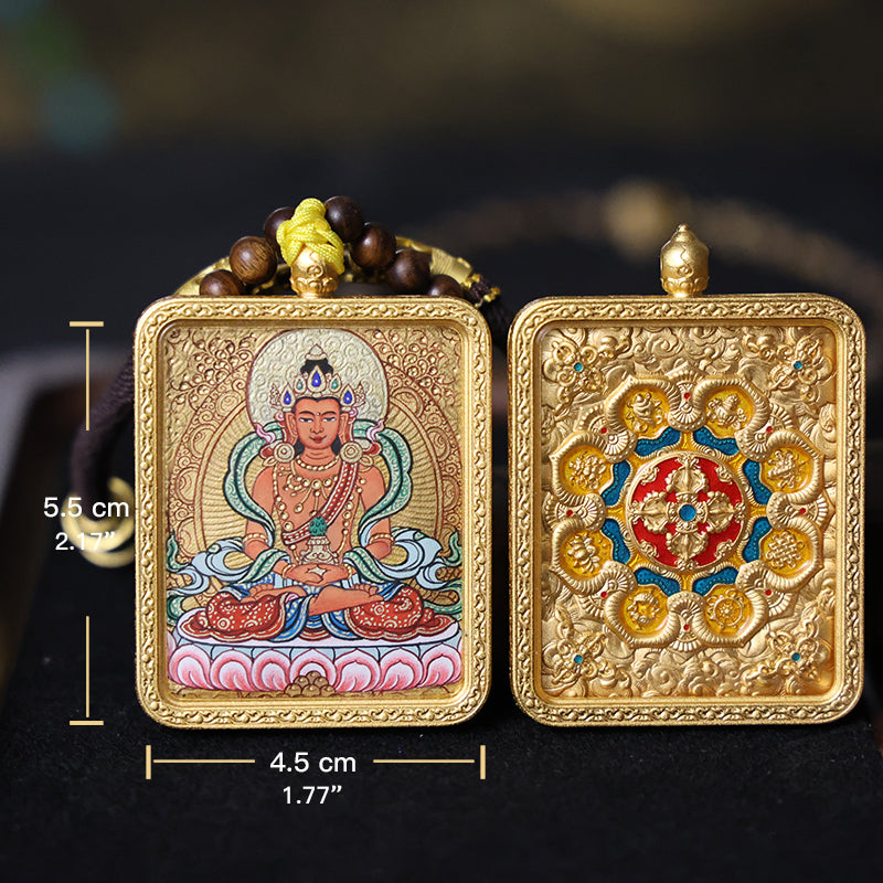 Sacred Appearance: A warm orange body (representing compassion and vital life force) sits cross-legged on a lotus throne, hands in dhyana mudra (implying the ritual of "holding the Longevity Vase").