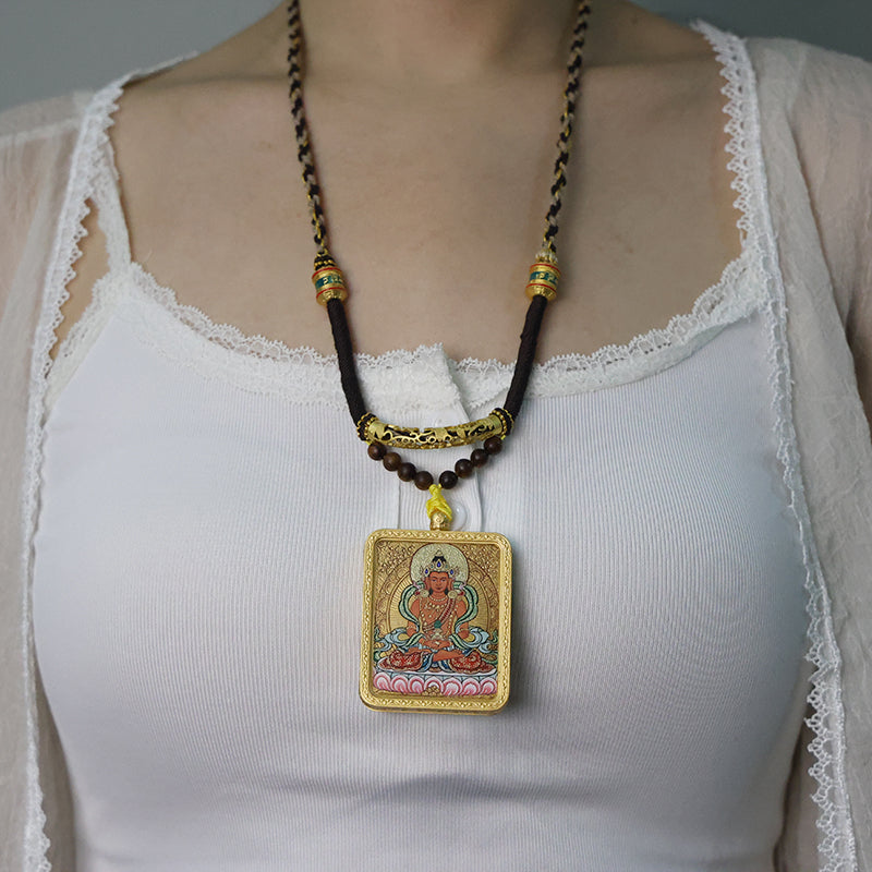 Auspicious Adornments: He wears a Five-Buddha Crown (the five top Buddhas symbolize the perfection of five wisdoms), celestial necklaces, and flowing blue-white robes. A green-gold gradient aureole surrounds him, enhancing the sacred aura and signifying wisdom illuminating all beings.