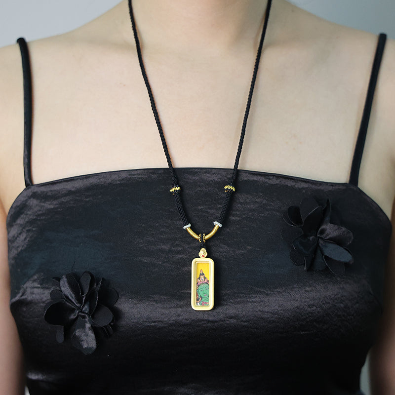 Green Tara, the core manifestation of the "Mother of Liberation" in Tibetan Buddhism, symbolizes boundless compassion that eases suffering and guards safety. This Thangka necklace turns her benevolent blessings into a portable treasure.