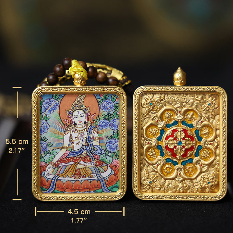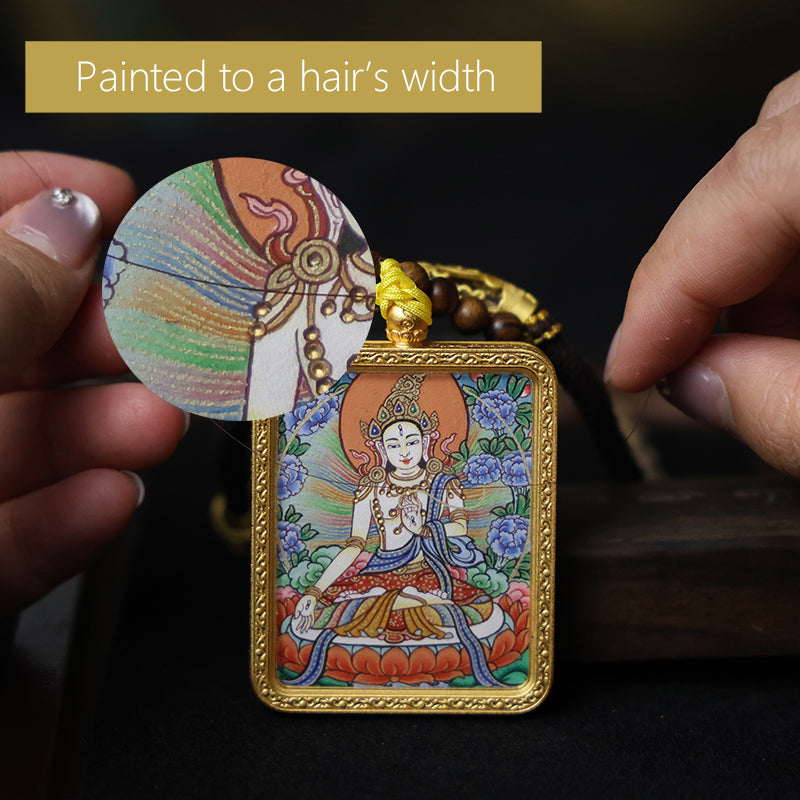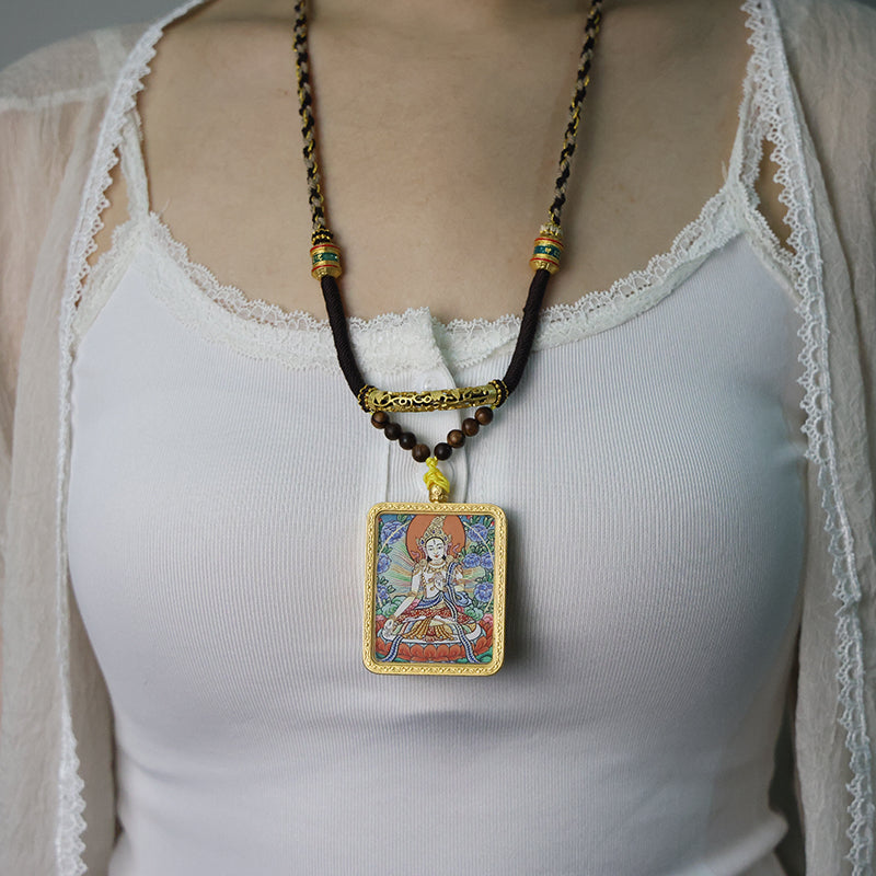 Wearing this White Tara Thangka Necklace is like carrying a "mobile blessing mural"—its vibrant color Thangka style with exquisitely fine lines weaves ancient spiritual wisdom into modern life, a tangible reminder that compassion and guardian energy accompany you every step of the way.