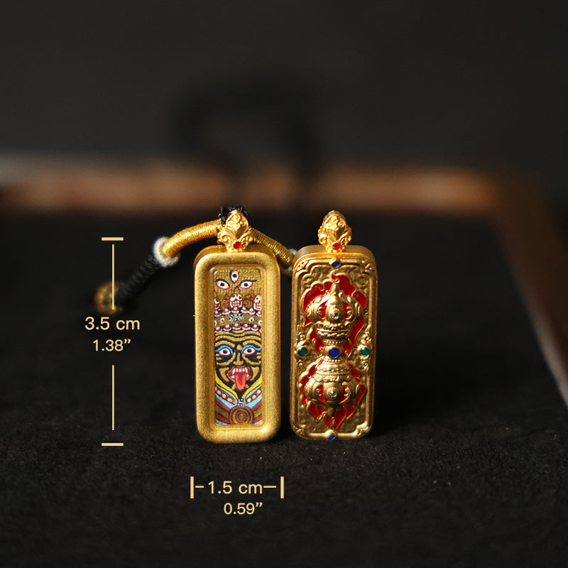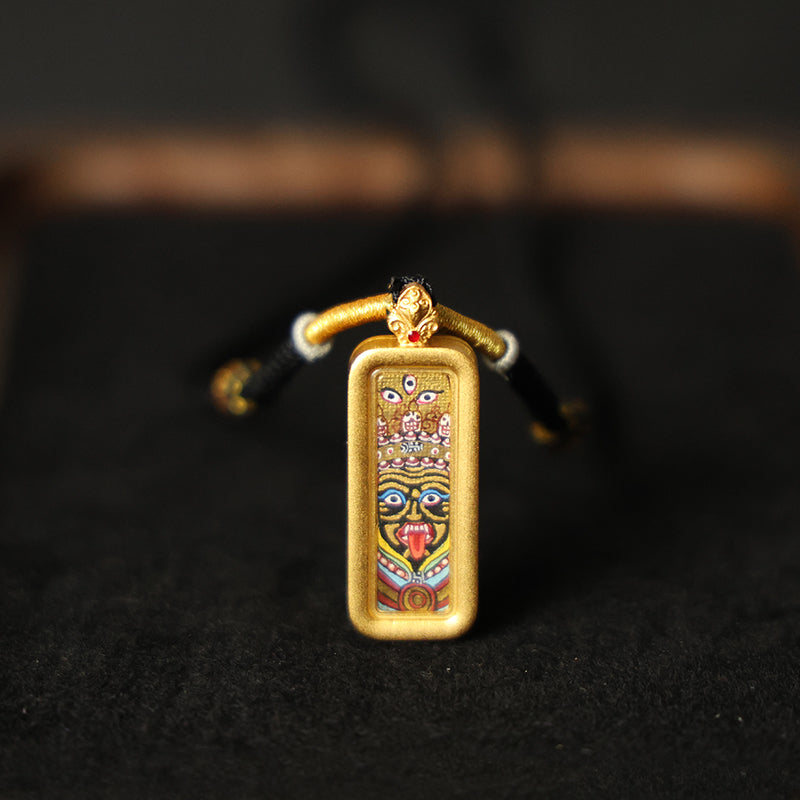 Crafted with natural mineral pigments (azurite for her black tiger head, vermilion for her curled tongue) and 18K gold accents on the five-skull crown, it captures her awe-inspiring yet benevolent essence.